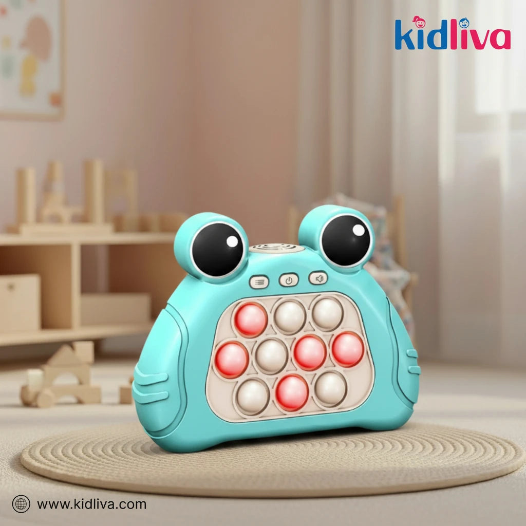 This Kidliva Frog Pop-It Fidget & Reaction Game Console is an adorable and engaging electronic toy that combines the satisfying tactile experience of pop-it fidget toys with the exciting challenge of a speed-tapping or memory game. Shaped like a cute blue frog with big, expressive eyes, this console features multiple soft, silicone "pop-it" bubbles that light up. The goal is to quickly press the lit bubbles as fast as possible or in a specific sequence, testing reaction time, memory, and finger dexterity. It's a fun, stimulating, and stress-relieving toy for children and even adults.