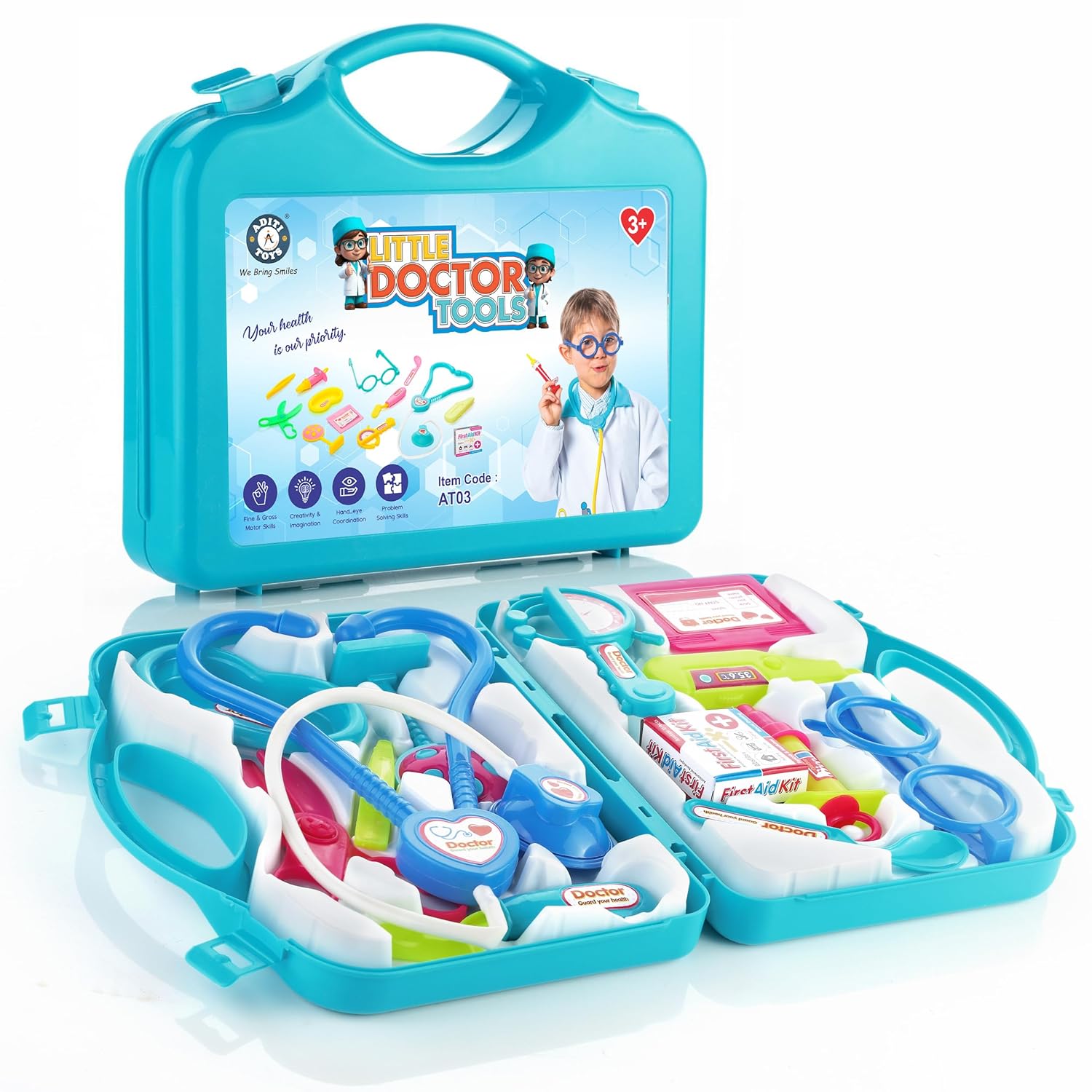 This doctor kit provides hours of fun while fostering valuable learning and social skills, with the central theme being: "Your health is our priority."