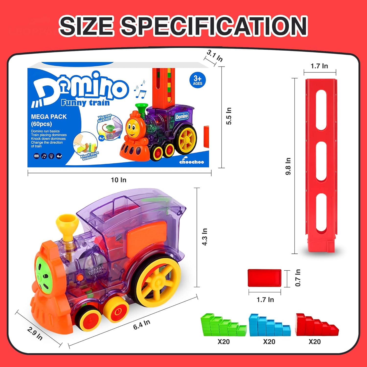 - Train Features: Flashing Lights and Sound, Chimney for loading dominoes, Ability to change the direction of travel.