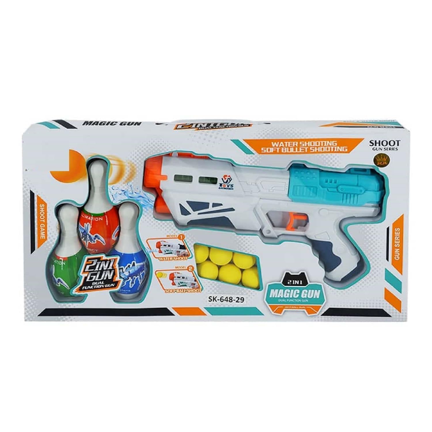 The Magic Gun (SK-648-29) is an exciting, versatile toy gun offering Dual Function play: it can shoot both Water and Soft Bullets. The set comes with the futuristic-looking white and blue/orange blaster and includes soft yellow foam bullets, along with two Pini Gun bowling pins for target practice. This 2-in-1 capability makes it perfect for varied indoor and outdoor action games, offering hours of safe fun.