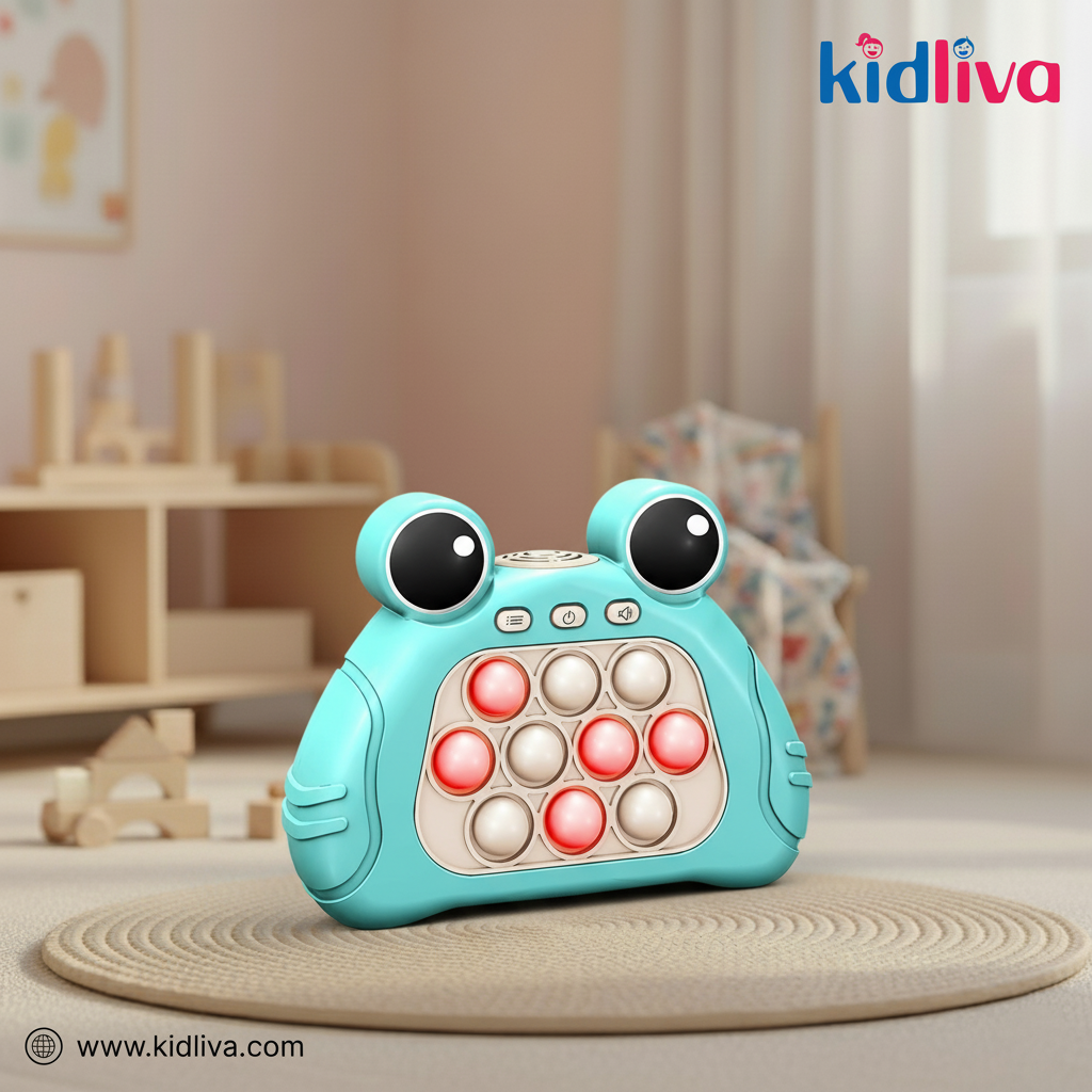 This Kidliva Frog Pop-It Fidget & Reaction Game Console is an adorable and engaging electronic toy that combines the satisfying tactile experience of pop-it fidget toys with the exciting challenge of a speed-tapping or memory game. Shaped like a cute blue frog with big, expressive eyes, this console features multiple soft, silicone "pop-it" bubbles that light up. The goal is to quickly press the lit bubbles as fast as possible or in a specific sequence, testing reaction time, memory, and finger dexterity. It's a fun, stimulating, and stress-relieving toy for children and even adults.