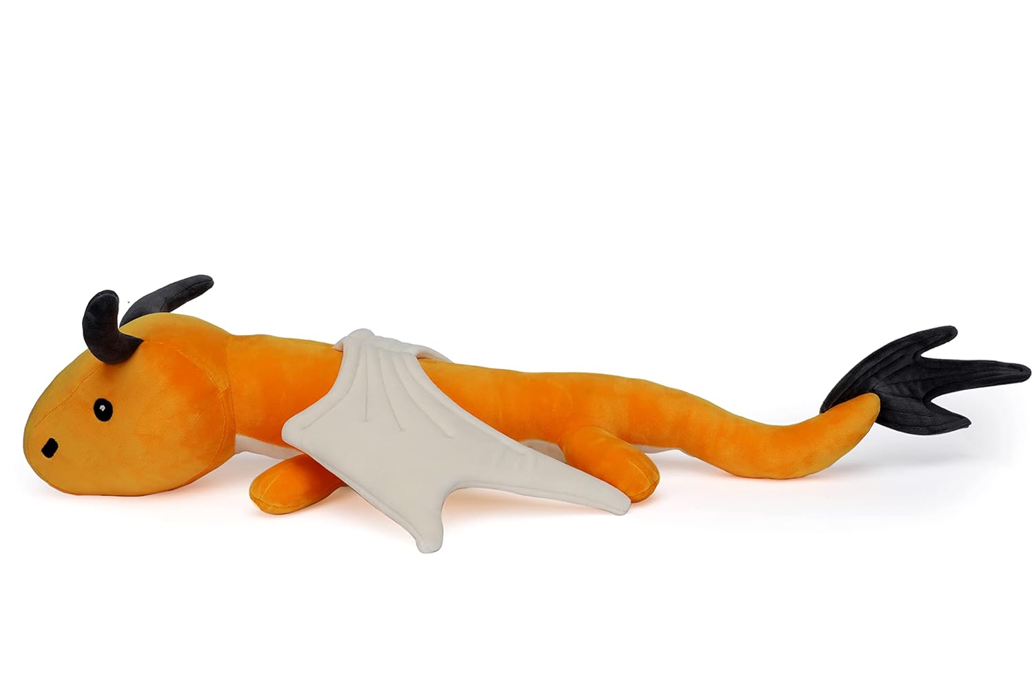 This Majestic Orange Dragon Plush Toy is a wonderfully soft, long stuffed animal companion designed to spark fantasy and adventure. The dragon features a bright orange body, black horns and tail flukes, and soft white wings draped over its back. Its elongated shape makes it perfect for hugging, draping over a shoulder, or using as a decorative piece in a fantasy-themed room. It is an ideal friend for encouraging imaginative play centered on mythical creatures and epic tales.
